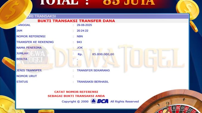 DEWATOGEL mengucapkan selamat kepada user id : LOP*** yang telah berhasil mendapatkan jackpot pada permainan LIVE CASINO DI ROULETTE. Kemenangan sebesar Rp 85.000.000,-. telah dibayarkan LUNAS oleh pihak dewatogel kepada pemilik user id setelah yang bersangkutan mengisi formulir withdraw. Proses pencairan dana berlangsung sangat cepat hanya dalam waktu 5-10 menit sudah berada dalam rekening pemilik user id. Bukti transfer yang dapat anda lihat adalah bukti SAH / VALID yang langsung di dapatkan melalui bukti transaksi dari Bank yang digunakan untuk pengiriman dana pada rekening pemilik user id. Terima kasih kami sampaikan kepada para pengguna setia DEWATOGEL yang telah menggunakan situs kami, sebagai Bandar Terpercaya yang pastinya membayar semua kemenangan member hingga lunas. Apakah DEWATOGEL PENIPU ? Reputasi “DEWATOGEL TERPERCAYA” sudah sangat melekat. puluhan hingga ratusan ribu pengguna setia DEWATOGEL tetap menggunakan situs terbesar dan terbaik di Indonesia ini. Hapus rasa was-was dan khawatir anda, kemenangan anda berapapun PASTI dibayarkan hingga lunas.